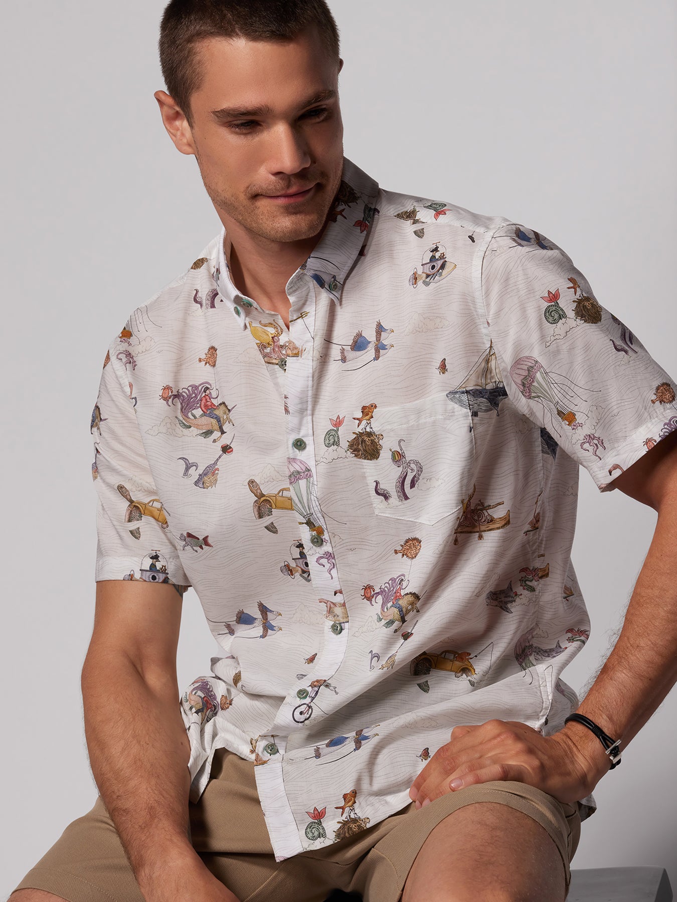 アーティスト、ローレン・トランマーとのコラボレーションでデザインされた「フィンズ・オブ・ハワイ」は、サメのヒレからサーフのヒレまで、太平洋で見られる様々な生き物の姿を探求した作品です。極上の柔らかさを誇るコットンテンシルポプリンにプリントし、プリント柄のポケットや刻印入りのボタンなど、Tori Richardならではのディテールをあしらっています。
