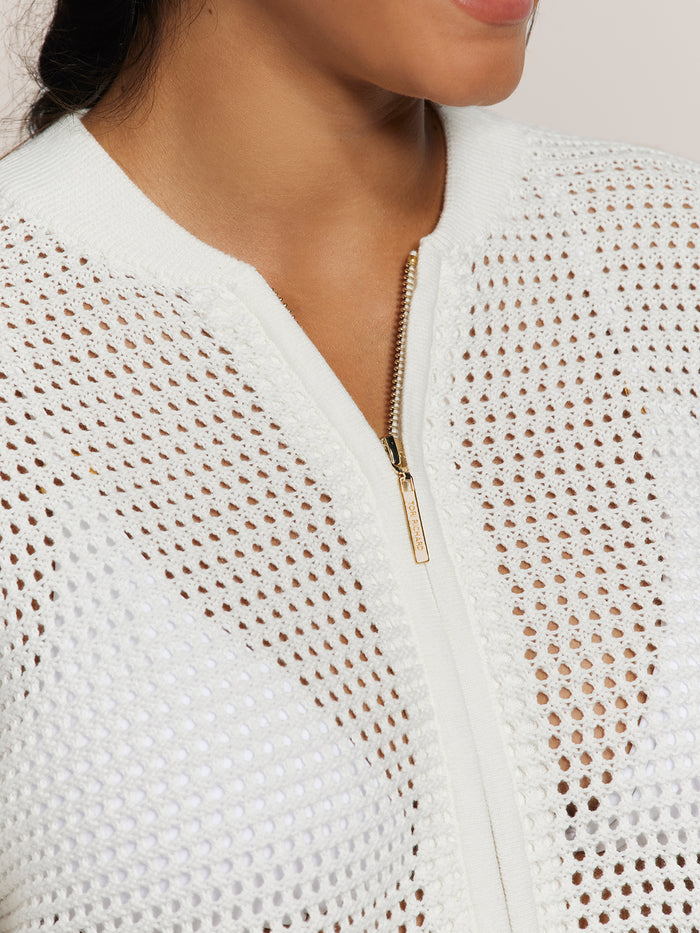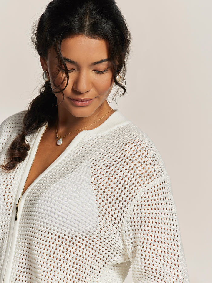 Umiカーディガンは、その汎用性と快適な軽やかな着心地から、「マストパック」の名にふさわしい一枚です。フロントジップで、水着やスリップニットの上に重ね着できます。コットンポインテールのオープンニットの質感が、風をたっぷりと通します。