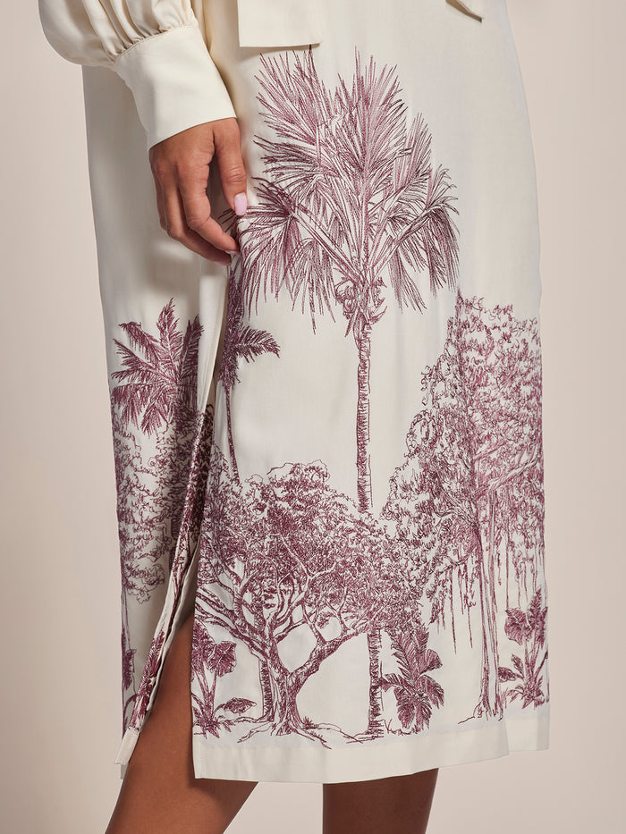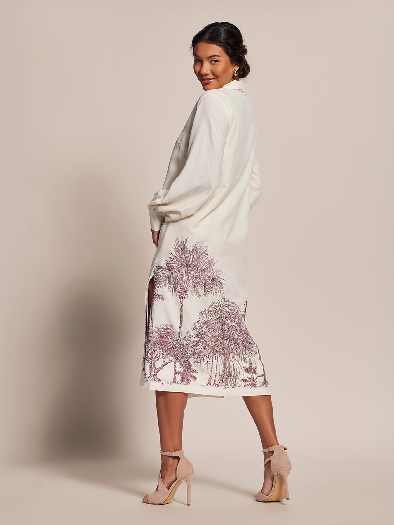 ウィノナ・カフタンでくつろぎのひとときを。ミドル丈のワンピースには、「For the Trees」プリントの刺繍が施されています。袖口のビショップスリーブがドラマチックな雰囲気を添えます。ネックラインのサッシュは、ゆるく結んでも、そのまま開いても、取り外してアクセサリーとしてもお使いいただけます。