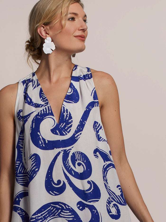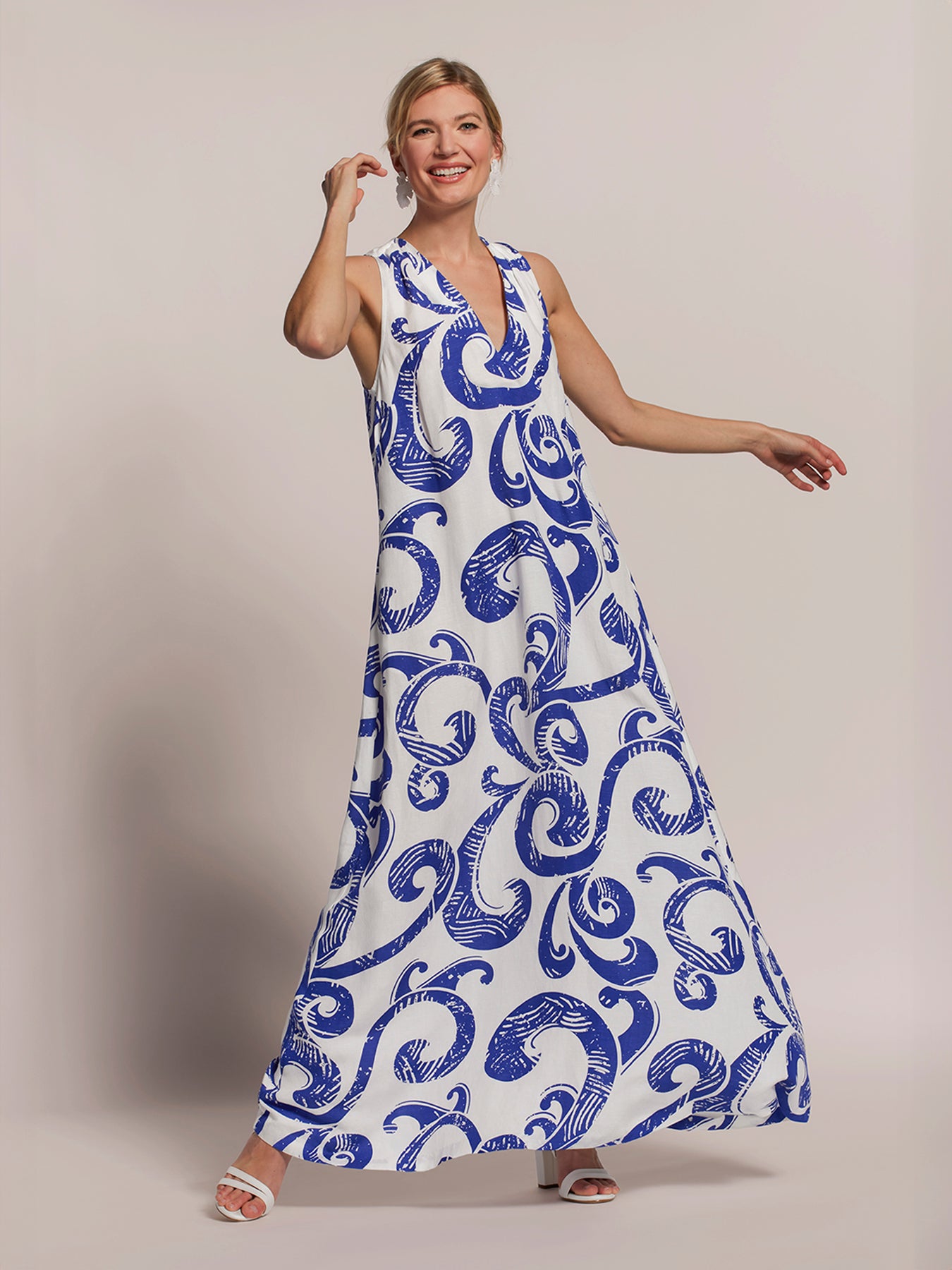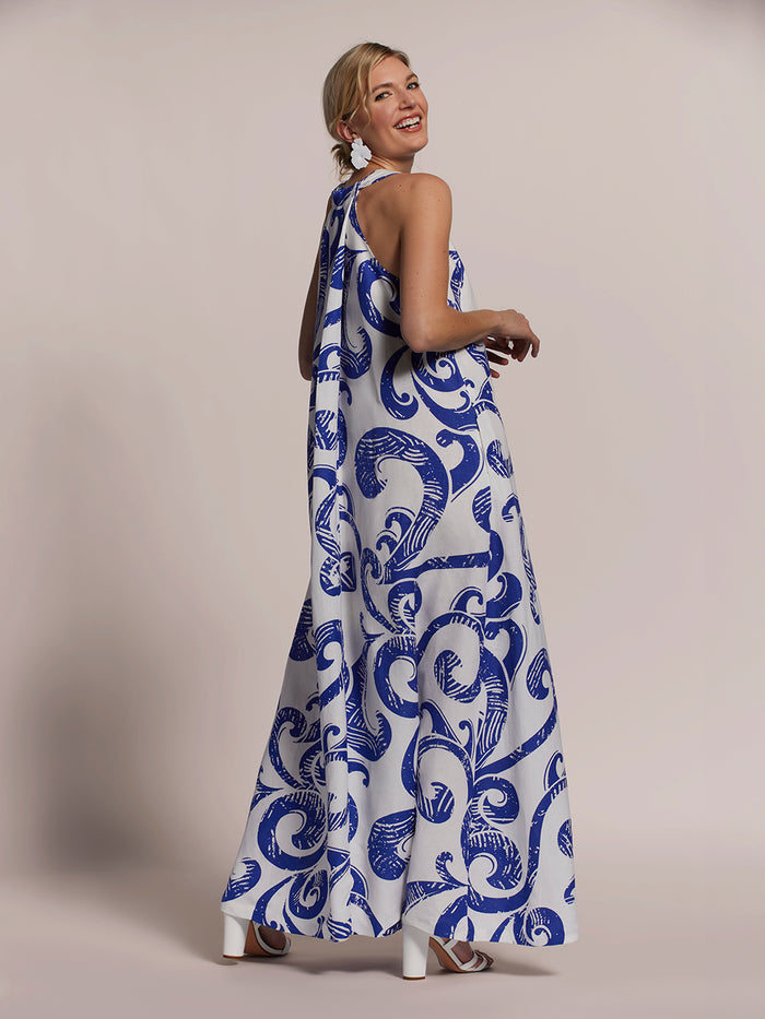 遊び心あふれる一日を演出するEidaドレス。Vネックラインと深いバックプリーツが特徴の、トラペーズシルエットのマキシ丈ドレス。シワになりにくいリネンとビスコースの混紡素材で織られています。