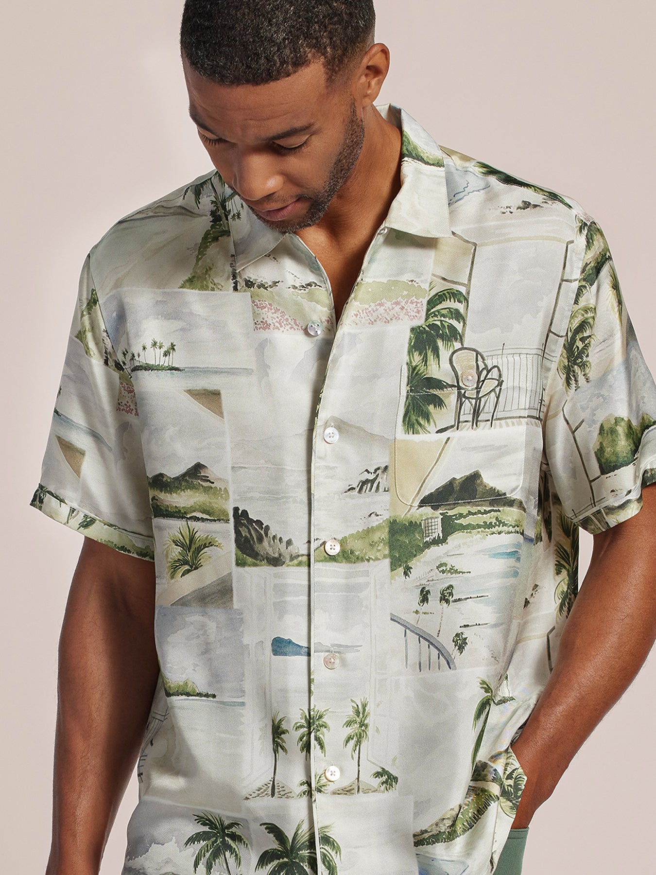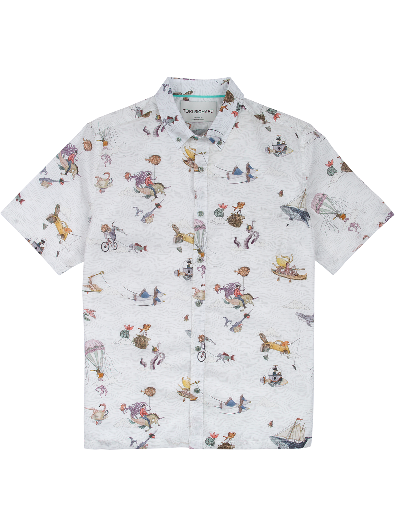 Designed in collaboration with artist Lauren Trangmar, Fins of Hawaii is a study in all the variations one might spot in the Pacific, from shark fins to surf fins (and beyond). Printed on super-soft cotton tencil poplin with signature Tori Richard details, like a print-matched pocket and engraved buttons.