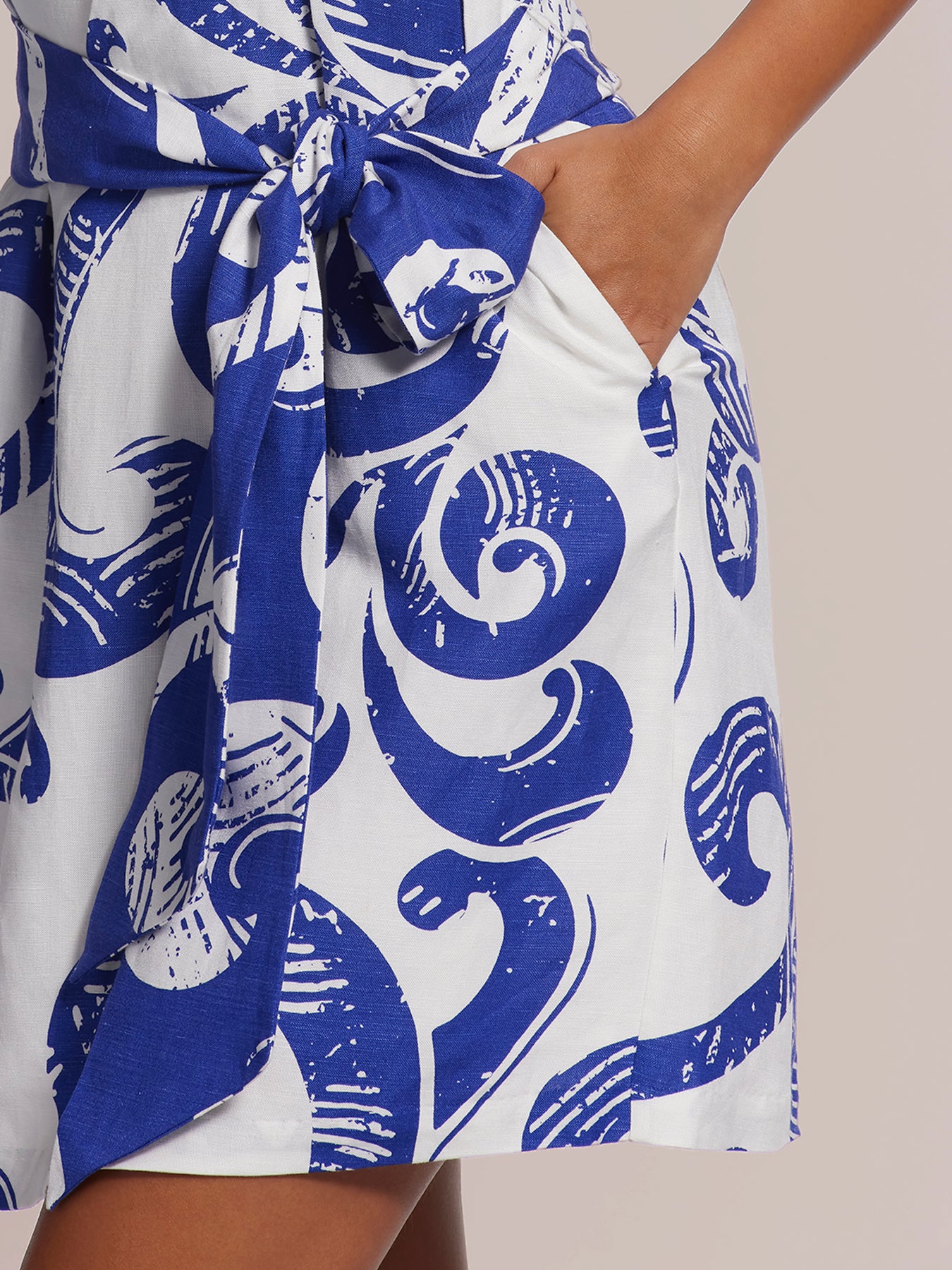 The Indiana Dress is a relaxed V-neck dress with a mini length and contrast print belt. Woven in a wrinkle-resistant linen-viscose blend.